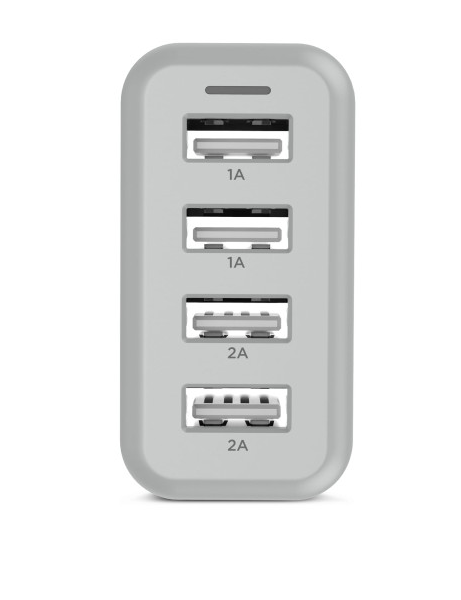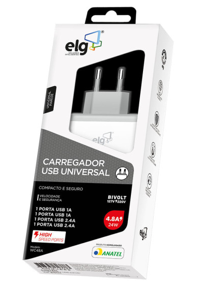 O carregador de parede Universal WC48A possui 4 portas USB (Ultra High Speed Port) sendo duas portas de 1A cada e duas porta de 2.4A, com capacidade total de 4.8A, que carregam rapidamente dispositivos móveis compatíveis como aparelhos eletrônicos portáteis que permitam carregamento via USB, como Tablets, GPS, Câmeras Digitais, MP3, MP4, entre outros dispositivos.