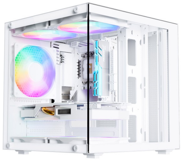 Assim como o modelo padrão, mantém o design dual chamber, frontal e lateral em vidro temperado, estrutura em SPCC 0,45mm, suporte para GPUs de até 260mm e coolers de até 165mm.