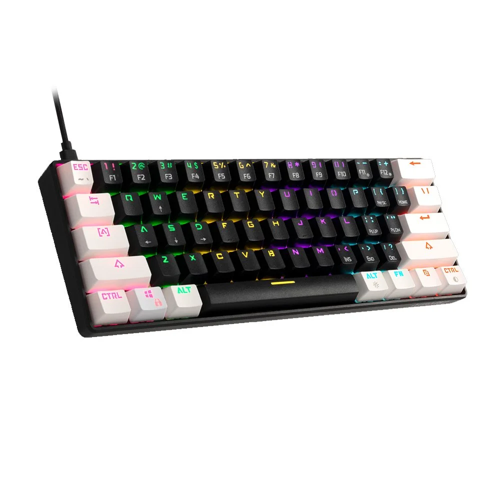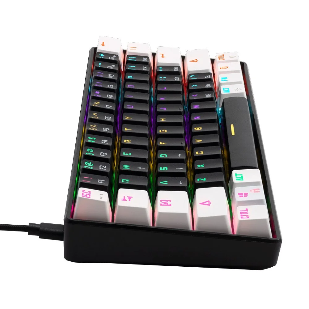 Pequeno e moderno o teclado compacto de 61 teclas vem em capas de teclas de duas cores disponíveis em layouts preto-branco ou branco-preto. Para portabilidade máxima, ele também vem com um cabo usb type-c para a incluído.