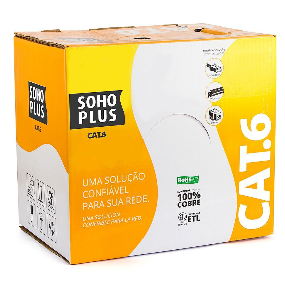 Informações adicionais: - Normas Aplicáveis ANSI/TIA-568-C.2 Category 6, NBR 14703, NBR 14705, ISO/IEC 11801 e IEC 60332. - Condutor Fio sólido de cobre eletrolítico nú, recozido, com diâmetro nominal de 24/23AWG - Isolamento: Polietileno de alta densidade com diâmetro nominal 1.0mm - Resistência de Isolamento: 10000mOhms.km - Quantidade de Pares: 4 Pares, 24/23 AWG - Par Os condutores isolados são reunidos dois a dois, formando o par. Os passos de torcimento devem ser adequados, de modo a atender os níveis de diafonia previstos e minimizar o deslocamento relativo entre si. - Núcleo: Os pares são reunidos com passo adequado, formando o núcleo do cabo. É utilizado um elemento central em material termoplástico para separação dos 4 pares binados - Blindagem: Não Blindado (U/UTP) - Peso do Cabo: 42kg/km - Classe de Flamabilidade: NBR 14705 CM: Deve estar de acordo com IEC 60332-3-25: "Test for vertical flame spread of vertically-mounted bunched wires or cables - Category D" NBR 14705 CMX: Deve estar de acordo com IEC 60332-1-2: "Test for vertical flame propagation for a single insulated wire or cable"