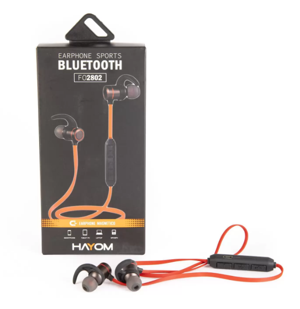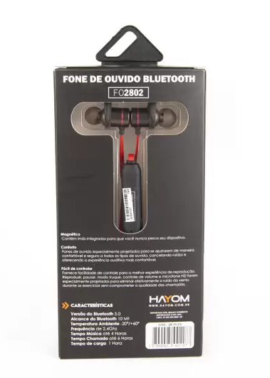 Earphone Bluetooth FO-2802 Hayom Sports Anti-Suor Magnético Fone de ouvido especialmente projetados para se ajustarem de maneira confortável e segura a todos os tipos de ouvido, cancelando ruídos e oferecendo a experiência auditiva mais confortável. Fornece facilidade de controle para a melhor experiência de reprodução. Reproduzir, pausar, modo truque, controle de volume e microfone HD foram especialmente projetados para eliminar efetivamente o ruído do vento durante os exercícios se comprometer a qualidade das chamadas. Contém trava a orelha, anti-suor, e imãs integrados para que você nunca perca seu dispositivo. FICHA TÉCNICA: - Versão do Bluetooth: 5.0 - Alcance do Bluetooth: 10 Mt - Temperatura Ambiente: -20°/+60° - Frequência de 2,4Ghz - Tempo de música: até 4 horas - Tempo de chamada: até 6 horas - Tempo de carga: 1 hora