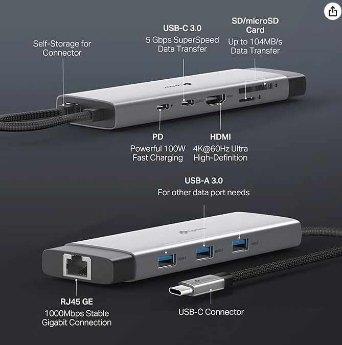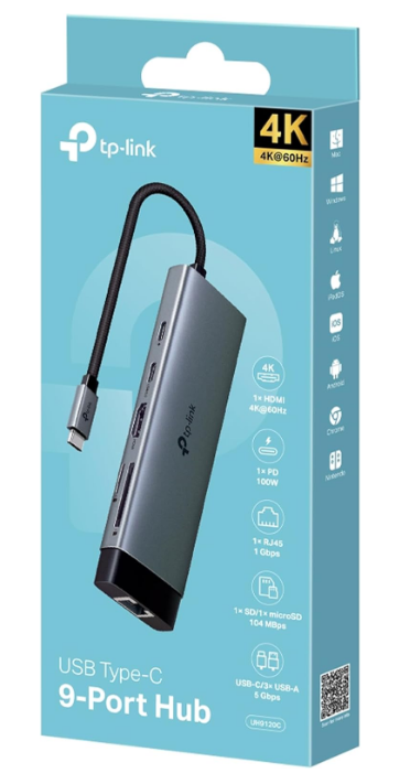 Hub usb tp-link 9 em 1 tipo-c uh9120c - tpn0510 usb type-c 9-in-1 hub, 4k@60hz hdmi, 1 gbps ethernet, sd & microsd uhs-i, 100w power delivery, 1ã? usb-c data port, 3ã? usb-a data ports.